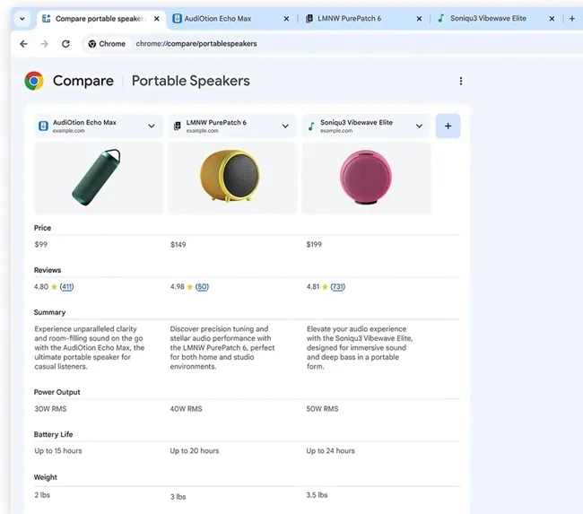 Fitur selanjutnya adalah Tab Compare yang sesuai namanya berfungsi untuk membandingkan produk. Namun, fitur ini bakal memberikan tampilan yang lebih sederhana dengan bantuan AI untuk mengambil informasi dari beberapa tab sekaligus dan membandingkannya side-by-side.