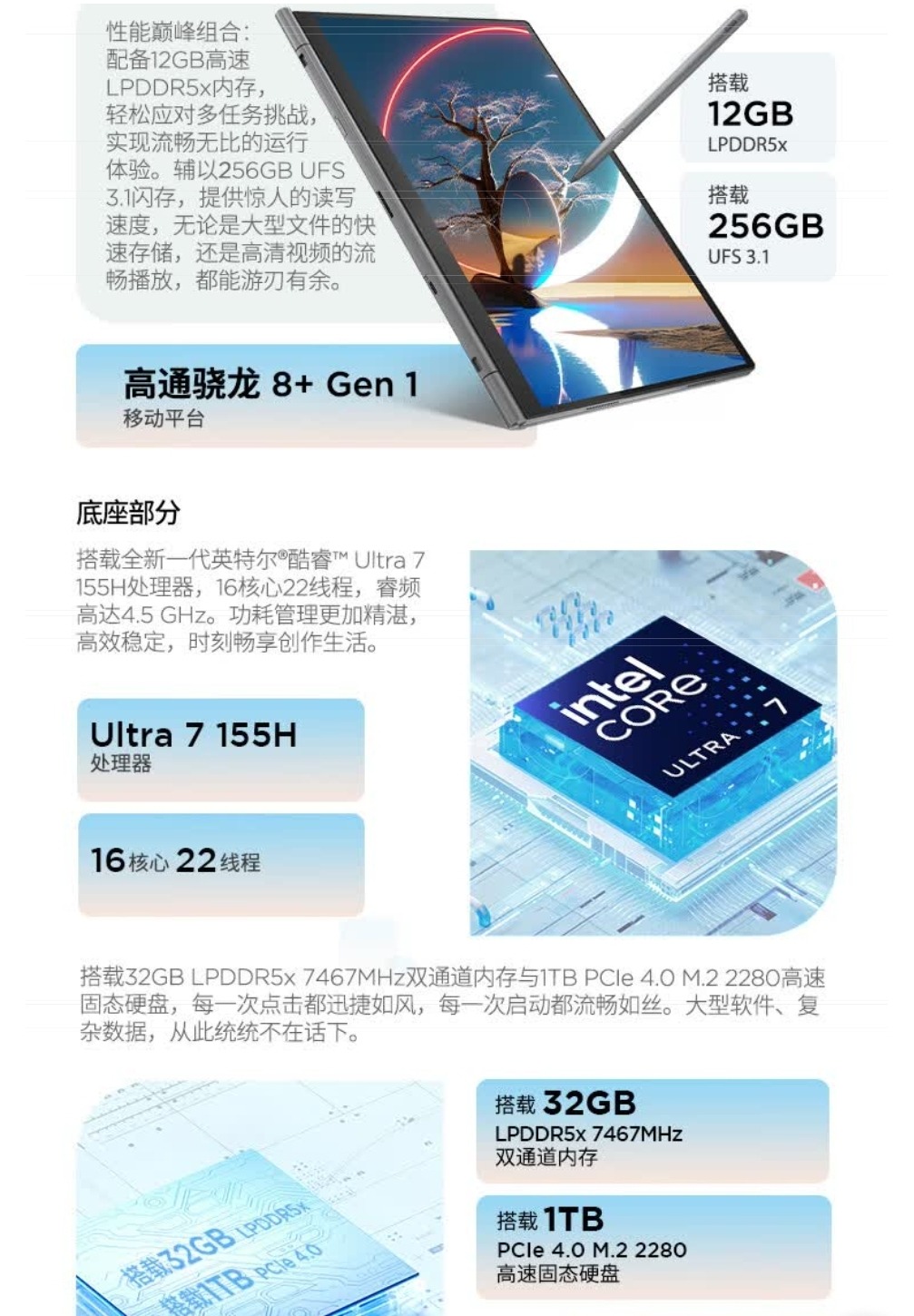 Untuk spesifikasinya, pada bagian keyboard, laptop ini dilengkapi dengan CPU Intel Core Ultra 7 155H, RAM LPDDR5X 32GB dan penyimpanan SSD 1 TB, sedangkan bagian tablet dilengkapi dengan RAM 12 GB LPDDR5X dan penyimpanan UFS 3.1 sebesar 256 GB pada tablet.