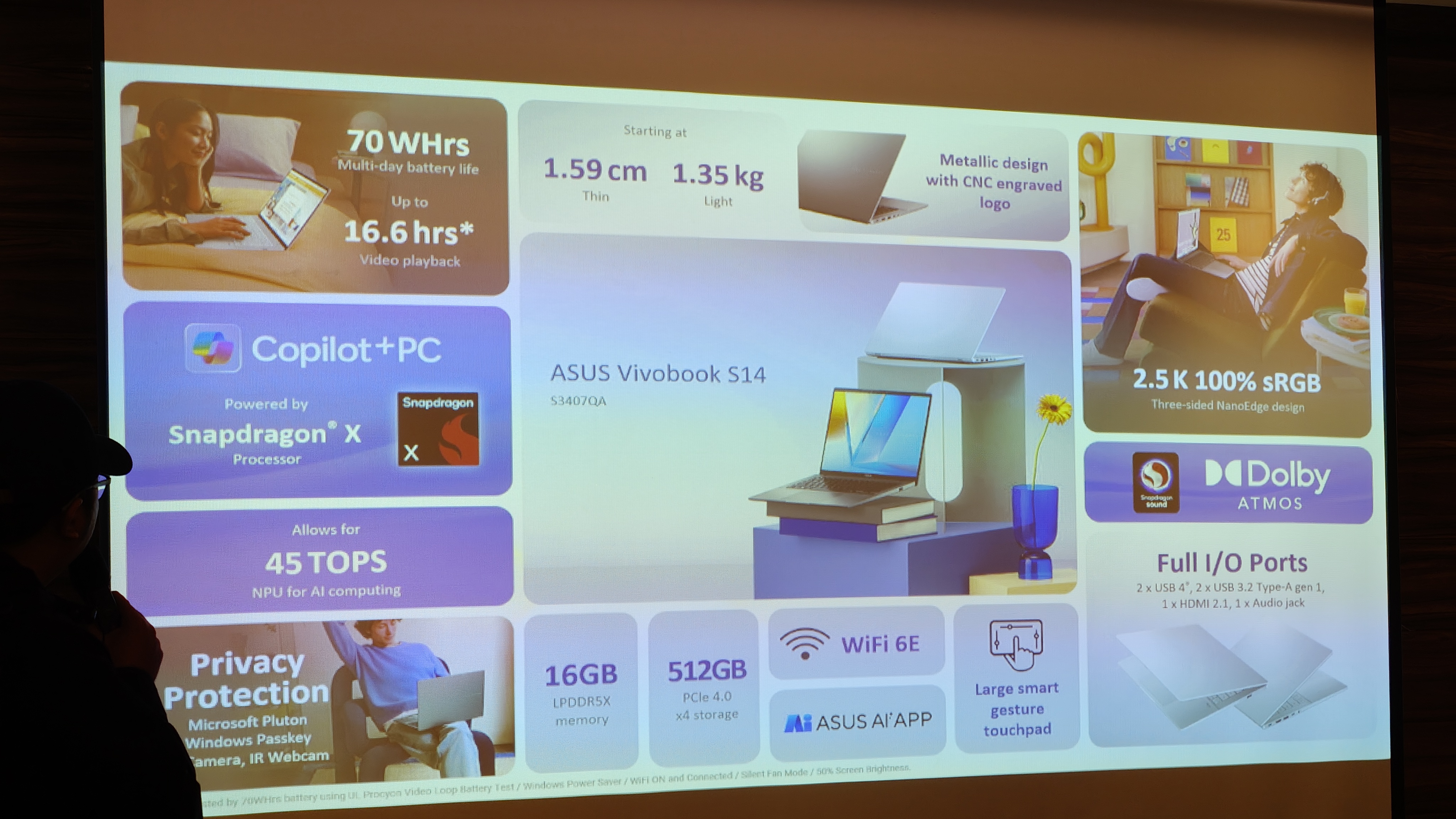 ASUS merancang Vivobook S14 dengan fokus pada portabilitas. Layarnya menggunakan panel IPS dengan resolusi 2.5K 60 Hz. Bobotnya hanya 1,35 kg dan ketebalan 15,9 mm, menjadikannya ideal untuk dibawa ke mana-mana. Daya tahan baterai juga jadi nilai jual utama, dengan kapasitas 70 Wh, daya tahannya diklaim mencapai hingga 16 jam penggunaan, cocok untuk bekerja seharian tanpa khawatir kehabisan daya. Dukungan konektivitasnya terbilang modern, dengan 2 port USB4, 2 port USB 3.2 Type A gen 1, 1 port HDMI 2.1, WiFi 6E, serta integrasi penuh dengan Microsoft Phone Link dan Snapdragon Seamless, menjadikannya perangkat serba bisa untuk ekosistem digital masa kini.