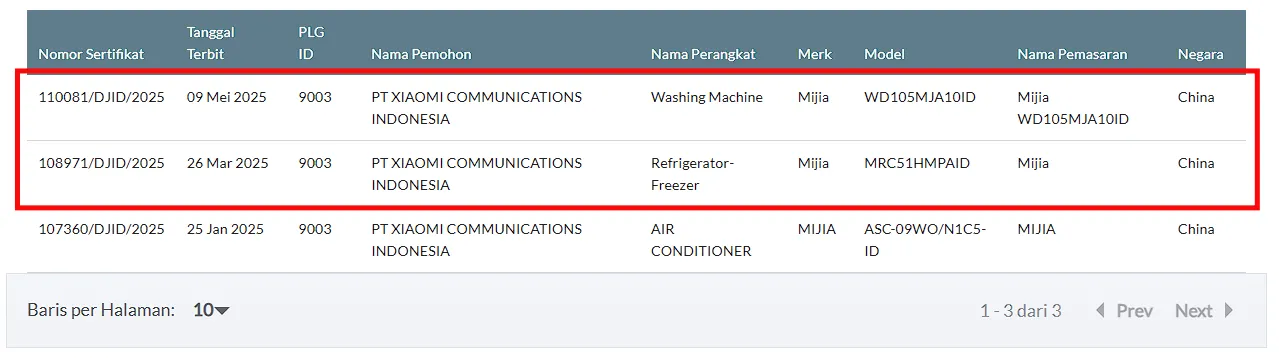 Indikasi tersebut kami temukan saat menyelami situs sertifikasi SDPPI Postel milik Komdigi. Xiaomi telah mendaftarkan produk “Washing Machine” dengan nomor model WD105MJA10ID dan “Refrigerator-Freezer” bernomor model MRC51HMPAID. Keduanya sama-sama akan dipasarkan di bawah branding Mijia, seperti AC-nya.