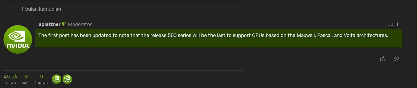 Pada saat pengumuman ini, versi driver yang tersedia untuk pengguna umum berada di v576.80 dan NVIDIA belum memberikan informasi lebih detail terkait perilisan driver v580. Kemungkinan masih ada waktu beberapa bulan lagi sebelum v580 dirilis sebagai update final untuk Maxwell, Pascal, dan Volta. Apakah kalian masih pakai salah satunya? Mending upgrade nggak sih?