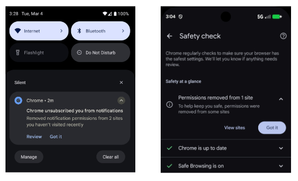 Menariknya, pengguna tetap akan diberi tahu kalau izin notifikasi suatu situs dicabut. Chrome bakal menampilkan notifikasi singkat yang memberi tahu bahwa situs tersebut tidak lagi bisa mengirim pesan. Kalau kalian masih ingin menerima notifikasi dari situs itu, izinnya bisa dikembalikan lewat menu Safety Check atau langsung dari pengaturan situs terkait.