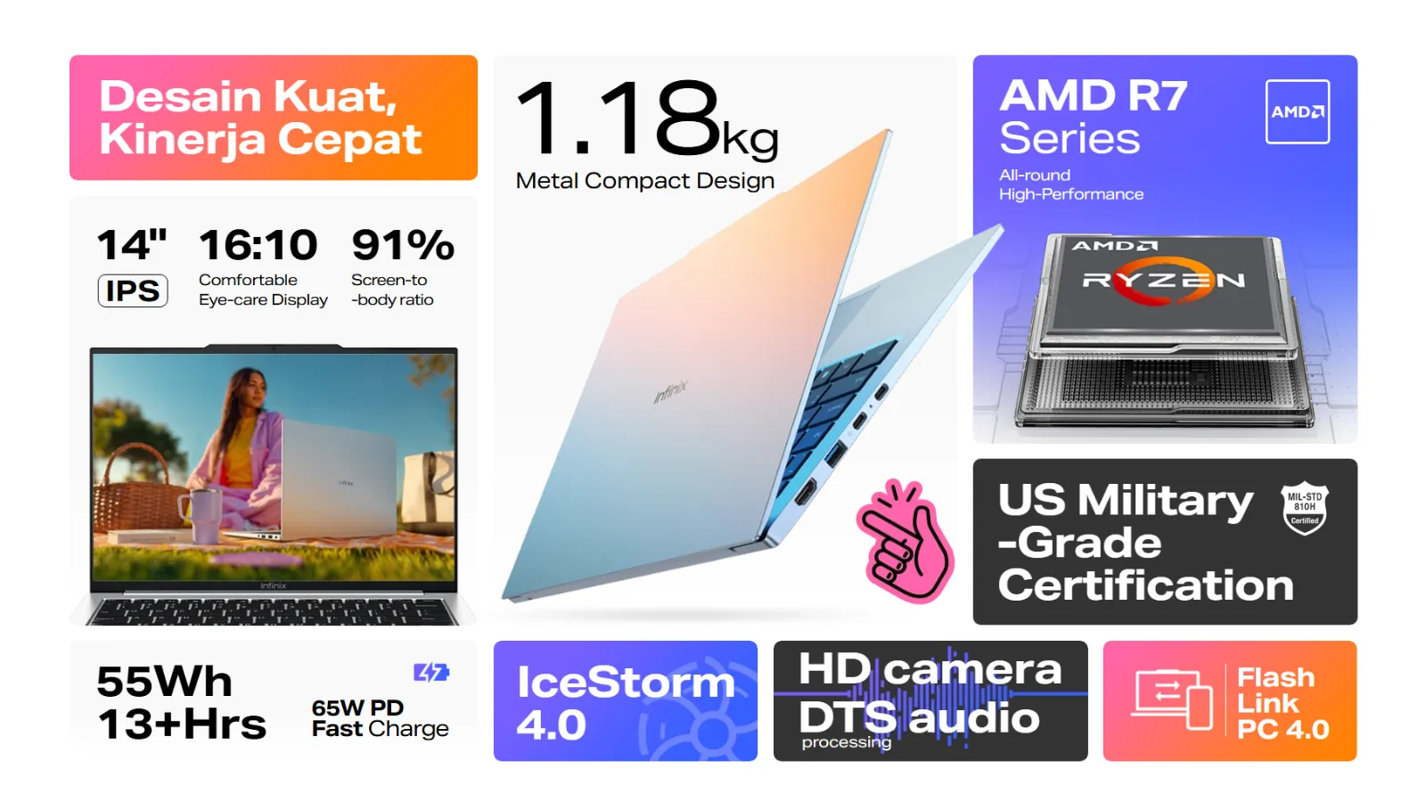 Infinix XBOOK B14 hadir dalam dua varian prosesor yakni AMD Ryzen 5 7535HS dengan 8-core / 16-threads atau Ryzen 7 7735HS yang punya 6-core / 12-threads. Ya, Infinix membenamkan seri HS dalam laptop ringkas yang punya bobot hanya 1.18 kg.