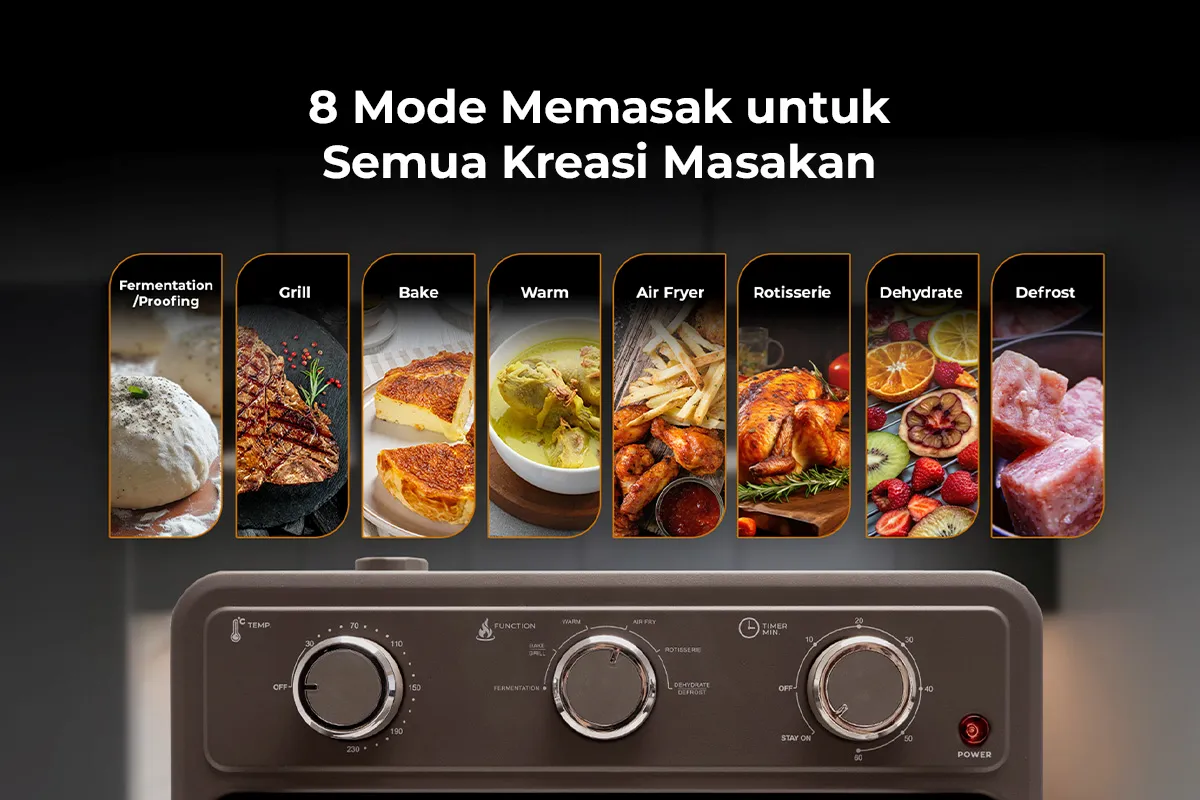 KitchenMate Air Fryer Oven ini memiliki 8 mode memasak, termasuk Rotisserie, Air Fry, Bake, Grill, Fermentation/Proofing, Warm, Dehydrate, dan Defrost. Fleksibilitasnya memungkinkan pengguna menggoreng tanpa minyak, memanggang roti, mengeringkan buah, hingga memanaskan masakan hanya dengan satu oven.