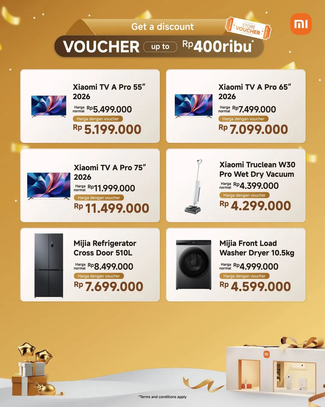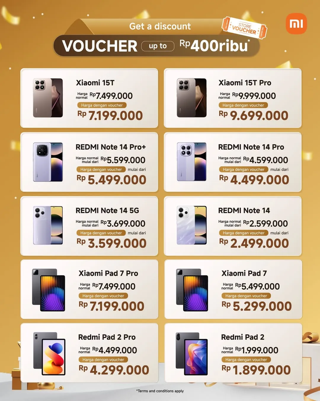 Salah satu penawaran utama adalah voucher diskon hingga Rp400.000 untuk berbagai kategori produk. Diskon ini bisa dimanfaatkan untuk smartphone, tablet, TV, hingga perangkat AIoT. Besaran potongannya berbeda tergantung produk.