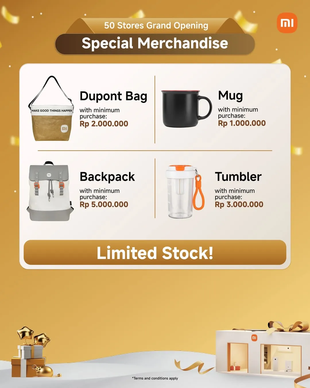 Selain diskon, Xiaomi juga menyiapkan merchandise eksklusif bagi pembeli dengan minimum transaksi tertentu. Mug bisa didapatkan dengan belanja minimal Rp1 juta, sementara Dupont Bag tersedia untuk transaksi Rp2 juta. Ada juga tumbler untuk pembelian Rp3 juta dan backpack eksklusif bagi transaksi Rp5 juta.