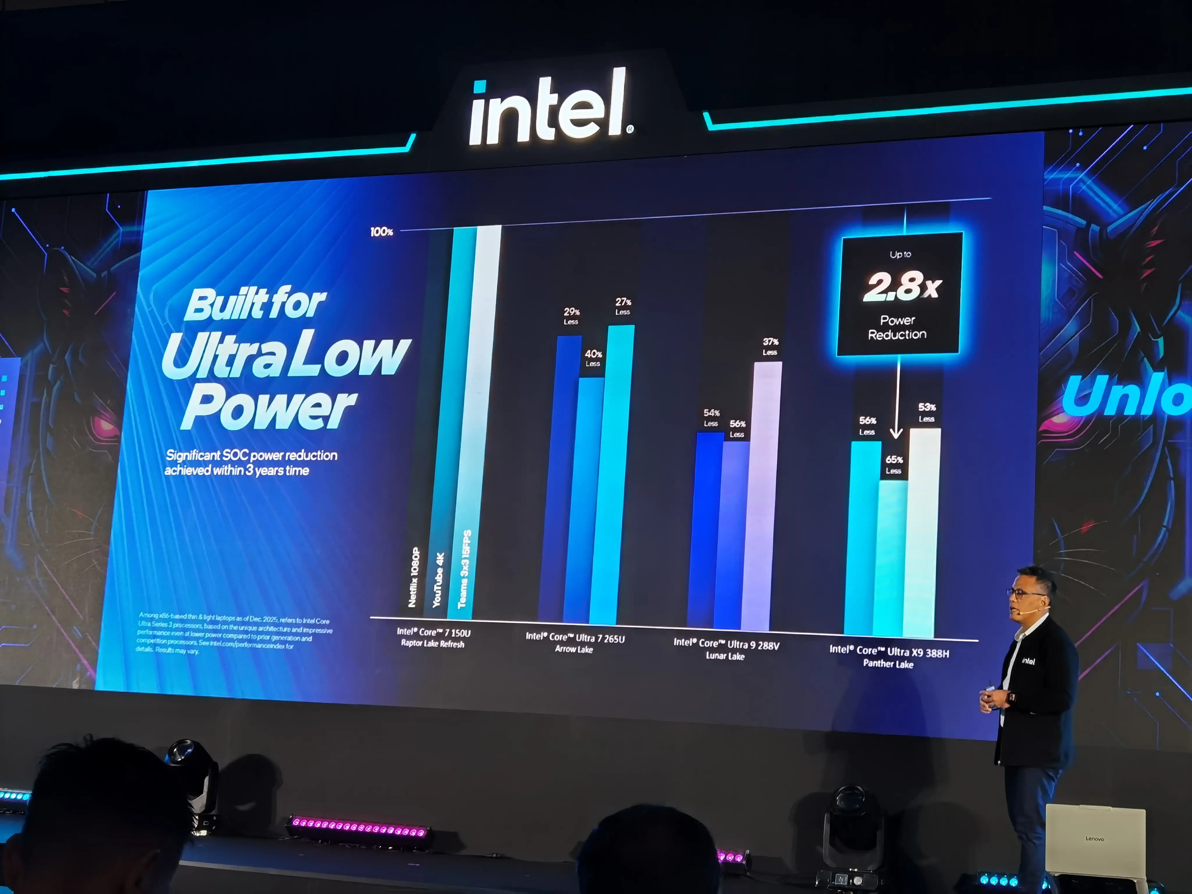 Dalam peluncuran tersebut, Intel sempat mendemokan performa dari laptop dengan prosesor Intel Core Ultra Series 3 dengan Game Battelfield 6. Dibekali juga dengan GPU Intel Arc terbaru, hasilnya bisa mendapatkan rata-rata frame rate 120 sampai 140 FPS, bahkan sampai 200 FPS. Ini sangat menakjubkan buat sebuah laptop tipis, yang selama ini selalu kompromi soal performa.