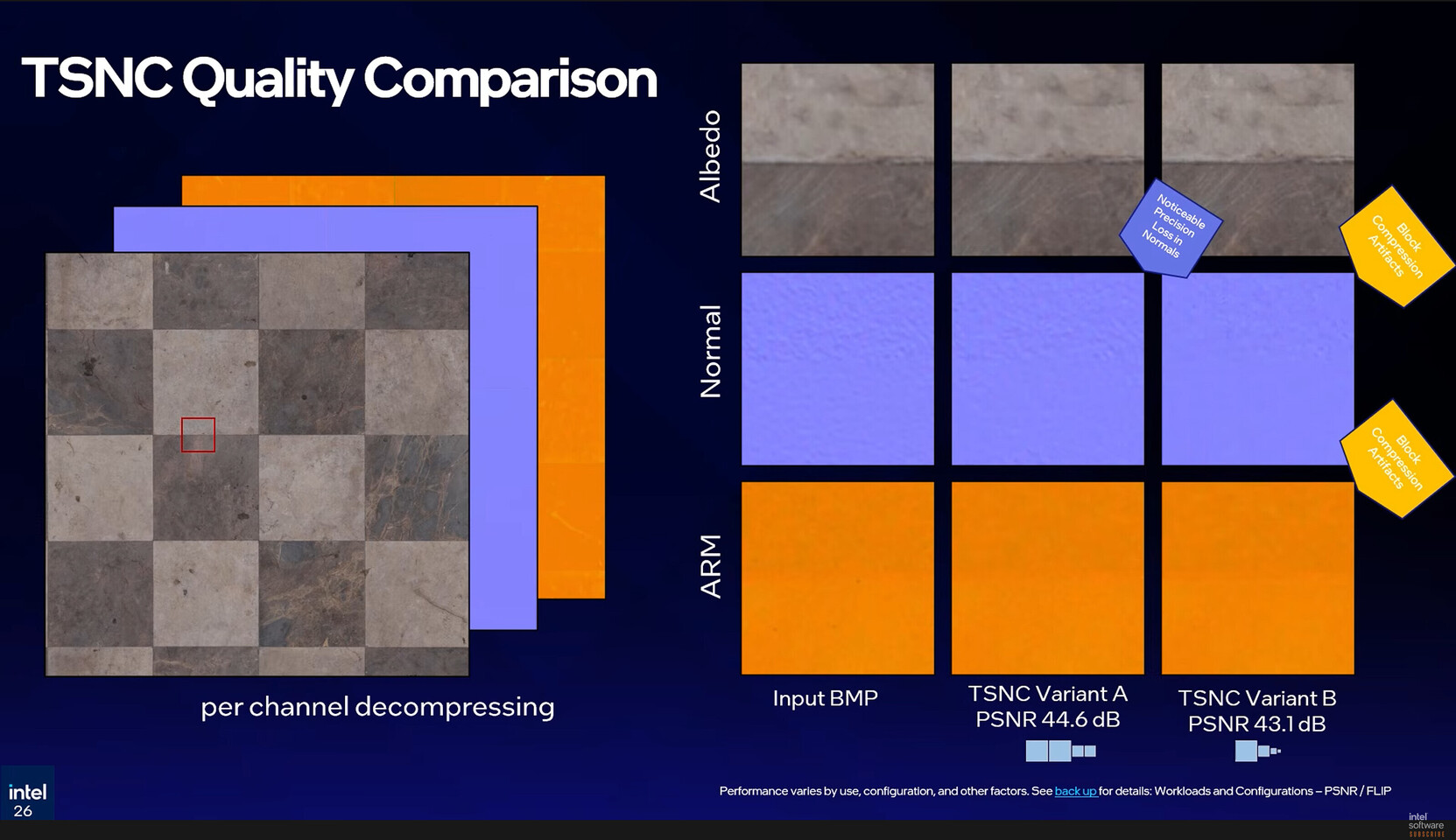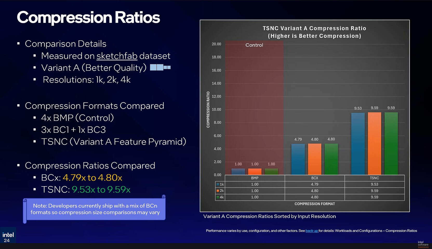 Untuk implementasinya, Intel membagi TSNC ke dalam dua varian. Variant A lebih difokuskan pada kualitas, dengan kompresi hingga 9 kali dan penurunan visual sekitar 5 persen. Sementara Variant B mengejar efisiensi maksimal, mampu mencapai kompresi hingga 18 kali, dengan penurunan kualitas yang sedikit lebih terlihat di kisaran 7 persen.